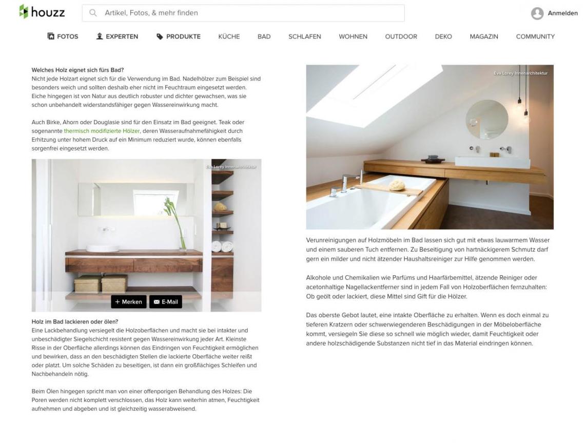 Die Redaktion von HOUZZ hat auf ihrer Website zwei meiner Projekt-Fotos in einem Artikel veröffentlicht: "Holz im Badezimmer – Experten-Tipps zu Einbau und Pflege. Holz in Nassräumen muss fachmännisch verbaut und angemessen gereinigt werden. Worauf genau sollte man dabei achten?"