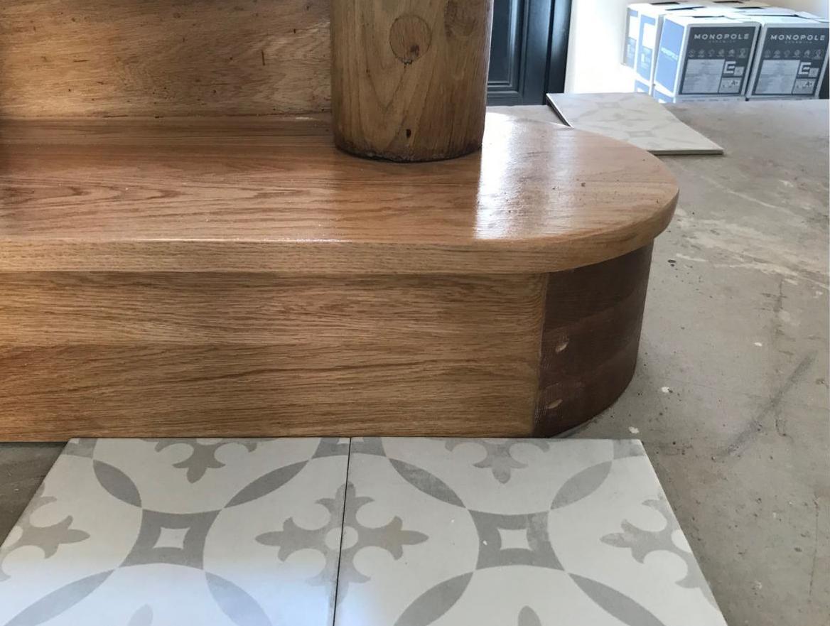 In einem Altbautreppenhaus werden gerade Fliesen aus glasiertem Feinsteinzeug in Zementfliesenoptik verlegt. Mit einer Abriebklasse PEI IV kann die Fliese bei hohen Beanspruchungen in Hauseingängen eingesetzt werden.