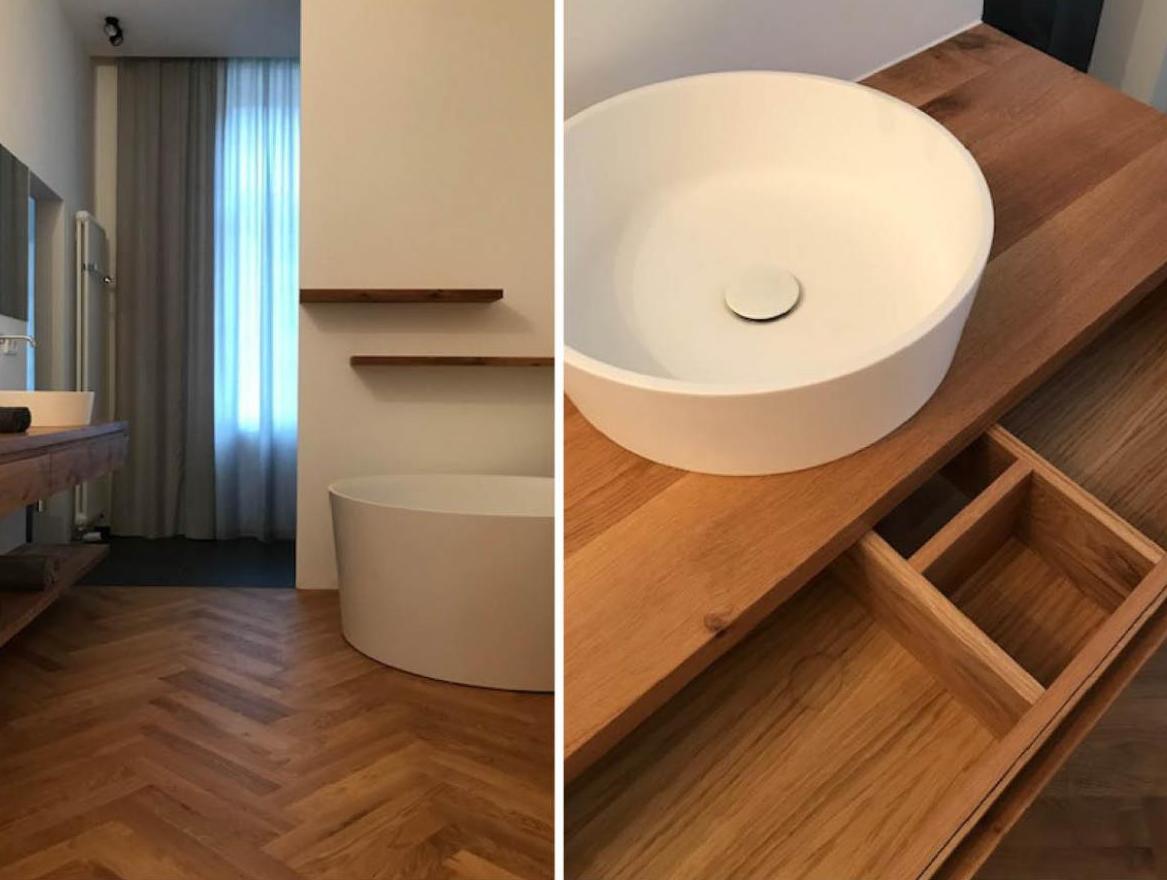 Nachdem 2018 das 1.OG umgebaut wurde, haben wir uns dieses Jahr mit dem EG befasst. Auch hier wurden Wände abgebrochen, Stahlträger eingezogen, Wände ergänzt, gespachtelt und tapeziert, Böden gefliest, Türen ausgetauscht und ergänzt. Die Elektrik und Beleuchtung wurde erneuert. Neben der Neugestaltung der Küche und Garderobe, entstand auch ein neues, geräumigeres Gäste WC mit Waschtisch aus massiver Eiche.