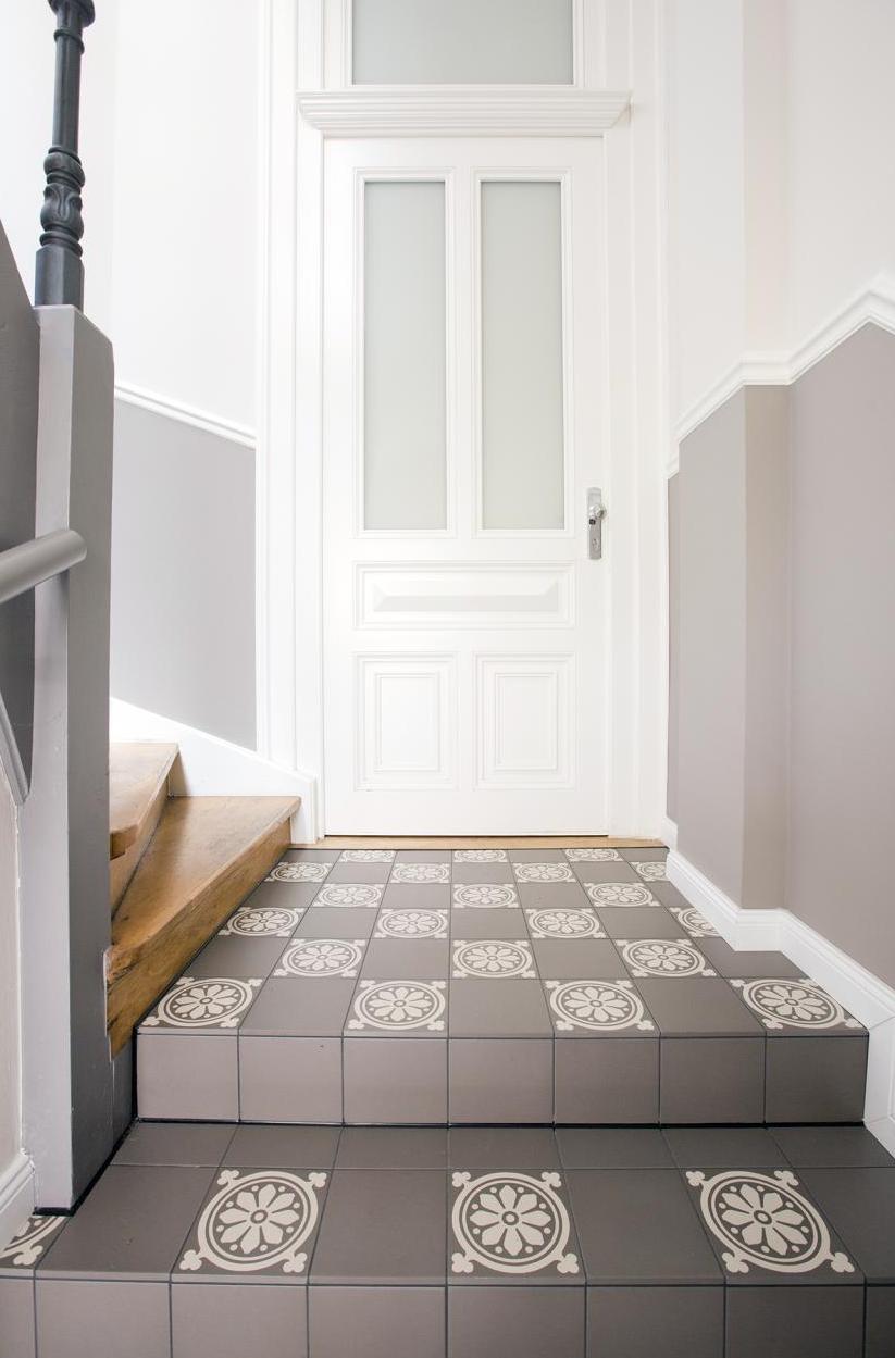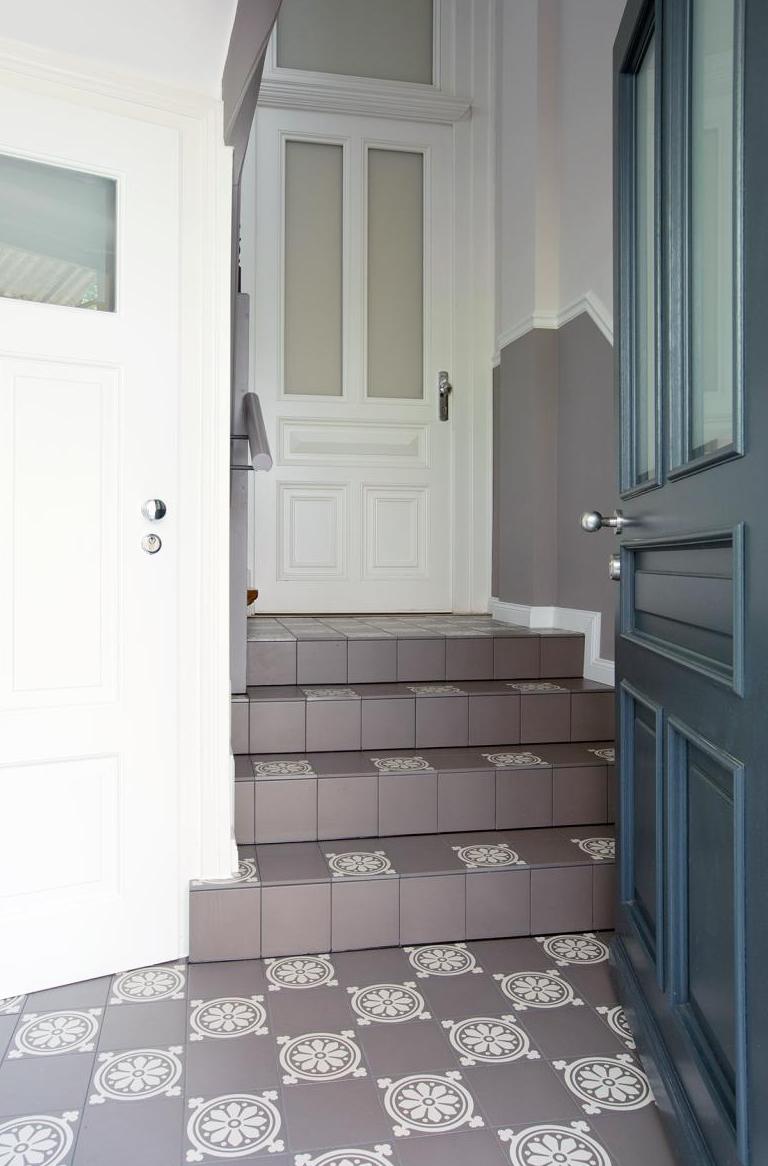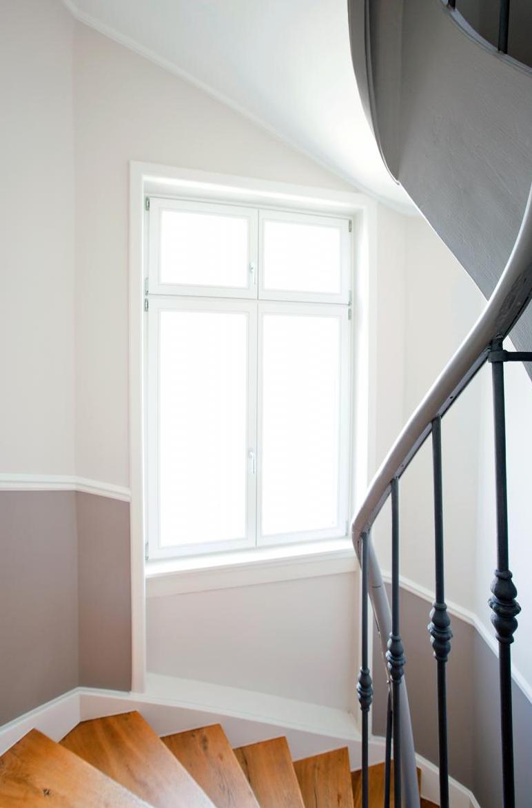 Leistungsphasen der HOAI: LP 1-3, 5-8. Entwurf und Realisierung, Sanierung und Renovierung eines Treppenhauses im Altbau. Innenarchitektur, Farb- & Materialkonzept, Ausschreibung, Bauleitung. Ersetzen der bauseitigen Kunsstofffenster in Holzfenster gemäß alter Bestandansichten mit Doppelflügel und Oberlichtern, Nachbau der ramponierten und defekten Kellertür, Verputzen und Tapezieren aller Wand- und Deckenflächen, Verlegen neuer Fliesen im alten Stil. Sanierung der defekten Sandsteineinfassung des Hauseingangs. Ersetzen der Hauseingangstür. Fotos: Sandra Hauer, Nahdran Photografie.