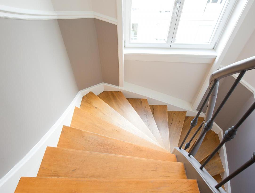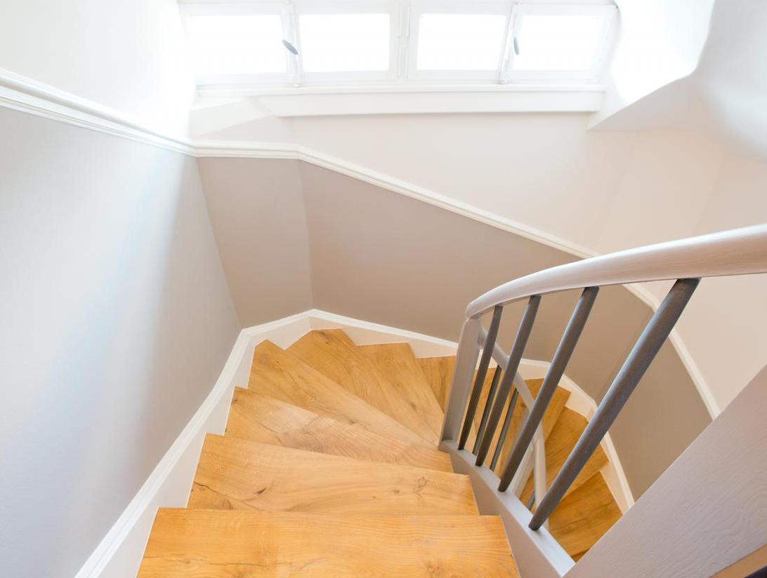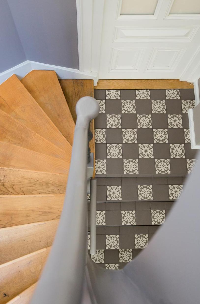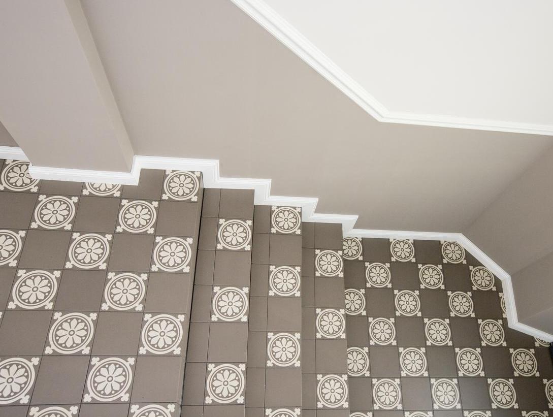 Leistungsphasen der HOAI: LP 1-3, 5-8. Entwurf und Realisierung, Sanierung und Renovierung eines Treppenhauses im Altbau. Innenarchitektur, Farb- & Materialkonzept, Ausschreibung, Bauleitung. Ersetzen der bauseitigen Kunsstofffenster in Holzfenster gemäß alter Bestandansichten mit Doppelflügel und Oberlichtern, Nachbau der ramponierten und defekten Kellertür, Verputzen und Tapezieren aller Wand- und Deckenflächen, Verlegen neuer Fliesen im alten Stil. Sanierung der defekten Sandsteineinfassung des Hauseingangs. Ersetzen der Hauseingangstür. Fotos: Sandra Hauer, Nahdran Photografie.