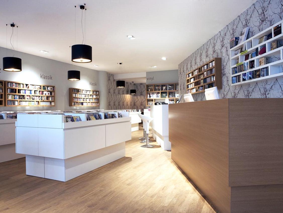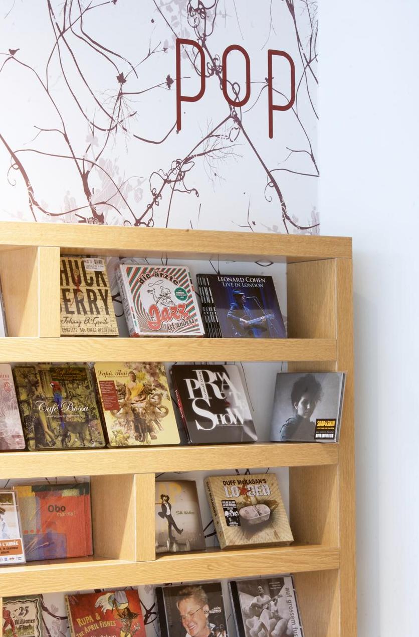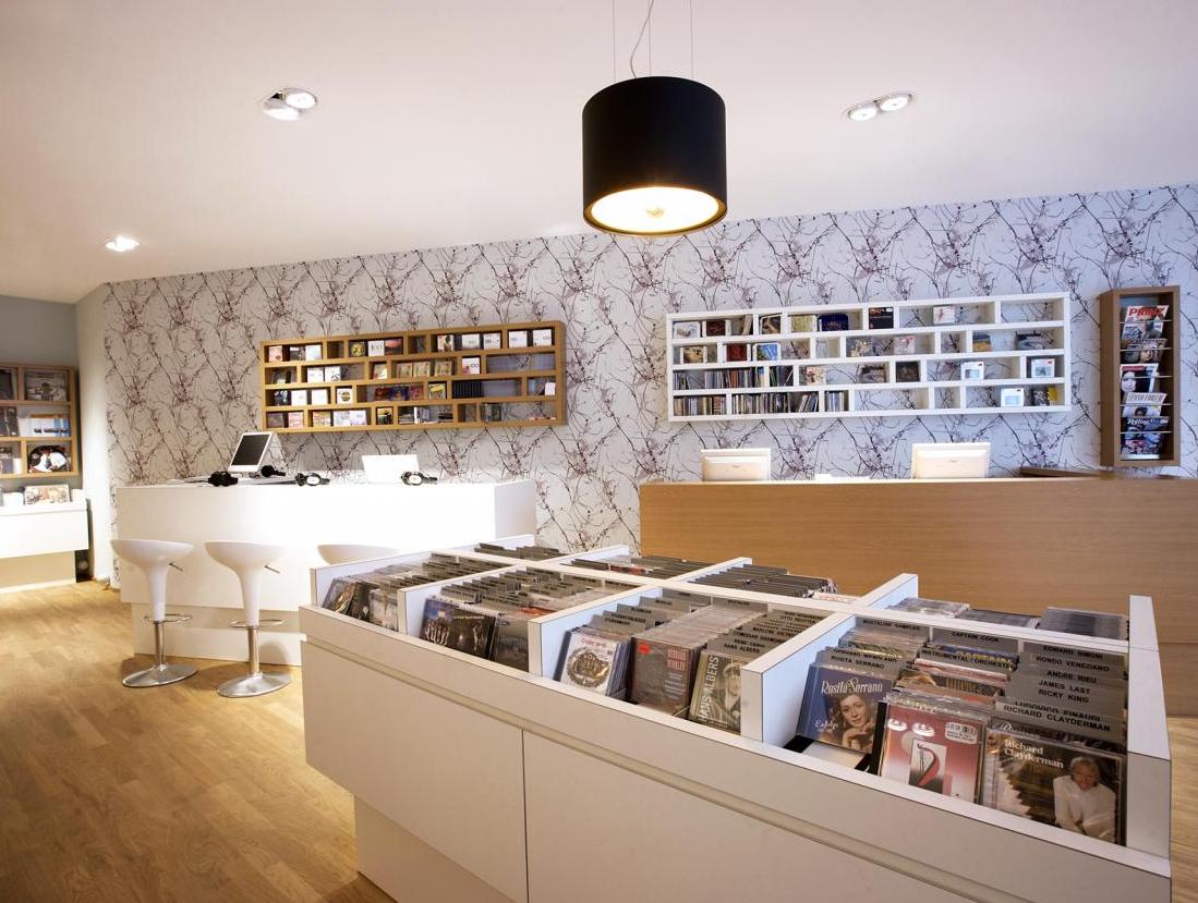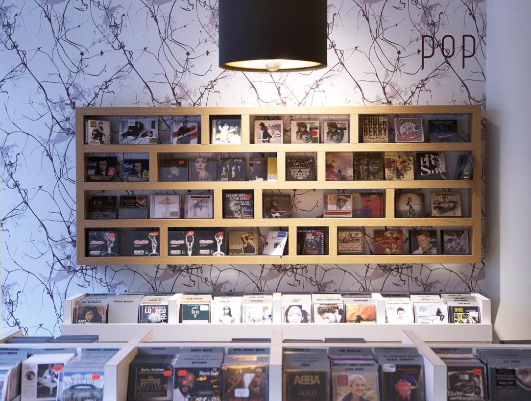 Für unseren Kunden realisierten wir auf ca. 100 qm, in der Darmstädter Innenstadt, ein Gesamtkonzept für einen CD-Laden, in dem man bei Kaffee und entspannter Atmosphäre, in einer großen Auswahl von CDs und Vinyl nach Klassik, Jazz und Pop stöbern kann. Der Innenausbau beinhaltete Raum- und Lichtkonzept, neue Bodenbeläge aus Eiche Parkett, glatte Abhangdecken, zum Teil tapezierte Wände, das Anpassen der bauseitigen Be- und Entlüftung, neue Elektrifizierung und alle Möbelentwürfe. Leistungsphasen der HOAI: LP 1-3, 5-8. Entwurf und Realisierung des Gesamtkonzeptes. Innenausbau, ca. 100 qm Ladenfläche, Darmstadt, Innenstadt. Fotos: Sandra Hauer, Nahdran Photografie.