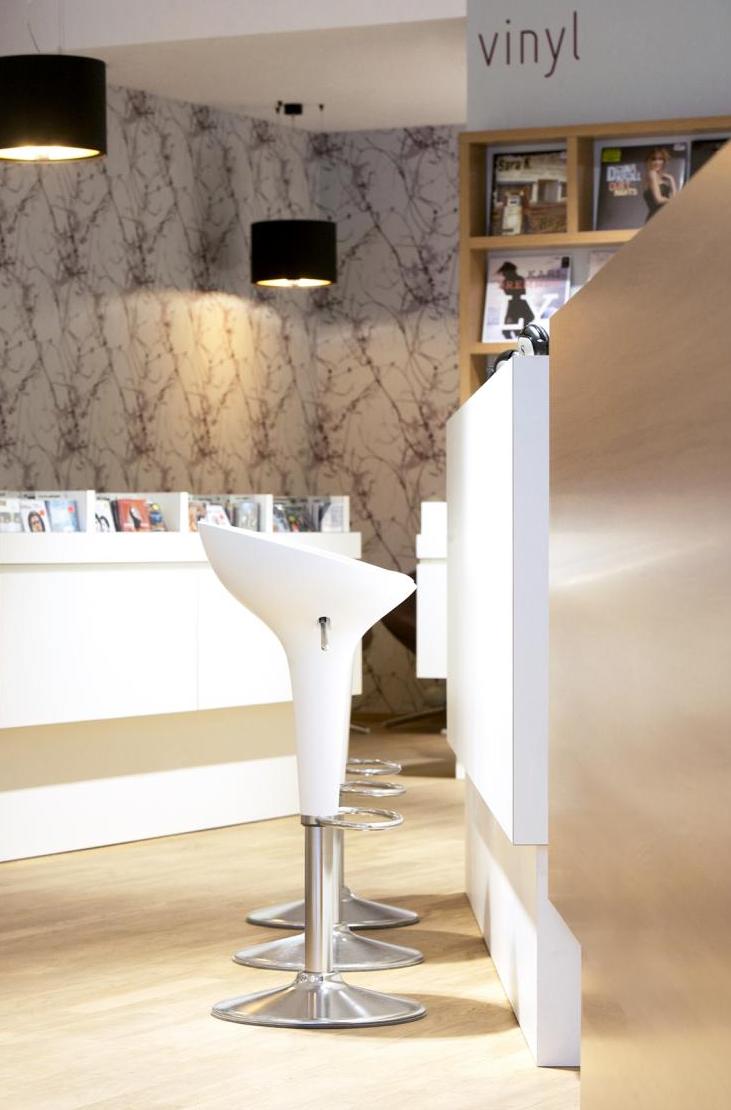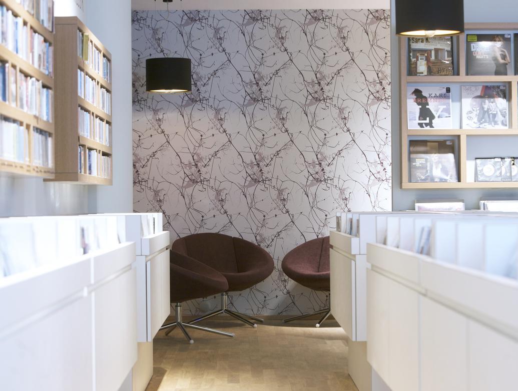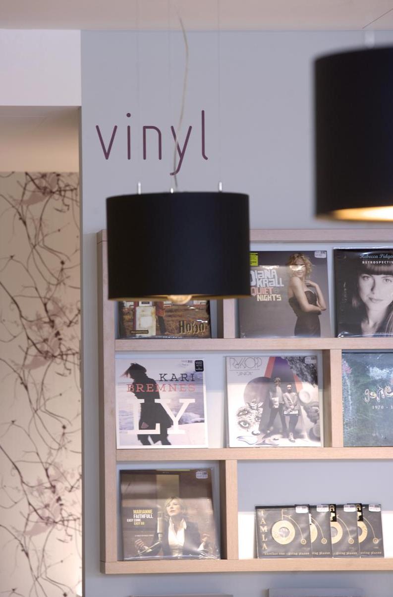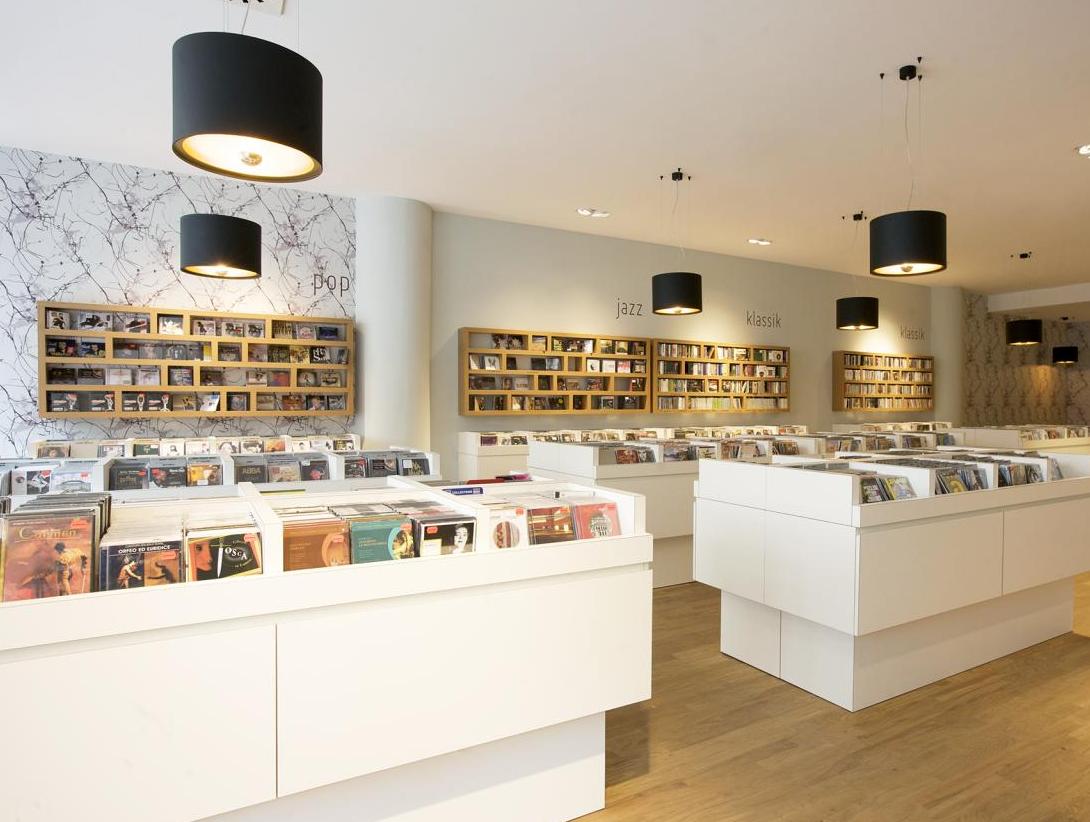 Für unseren Kunden realisierten wir auf ca. 100 qm, in der Darmstädter Innenstadt, ein Gesamtkonzept für einen CD-Laden, in dem man bei Kaffee und entspannter Atmosphäre, in einer großen Auswahl von CDs und Vinyl nach Klassik, Jazz und Pop stöbern kann. Der Innenausbau beinhaltete Raum- und Lichtkonzept, neue Bodenbeläge aus Eiche Parkett, glatte Abhangdecken, zum Teil tapezierte Wände, das Anpassen der bauseitigen Be- und Entlüftung, neue Elektrifizierung und alle Möbelentwürfe. Leistungsphasen der HOAI: LP 1-3, 5-8. Entwurf und Realisierung des Gesamtkonzeptes. Innenausbau, ca. 100 qm Ladenfläche, Darmstadt, Innenstadt. Fotos: Sandra Hauer, Nahdran Photografie.