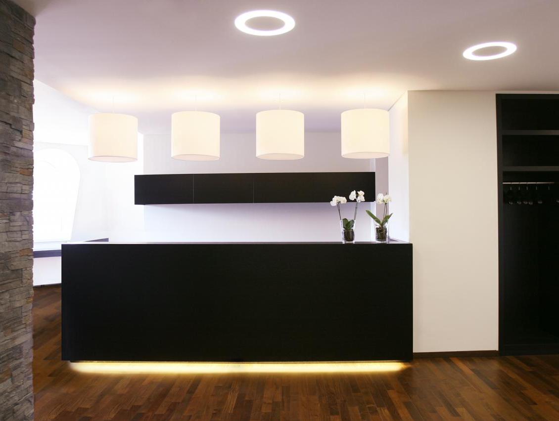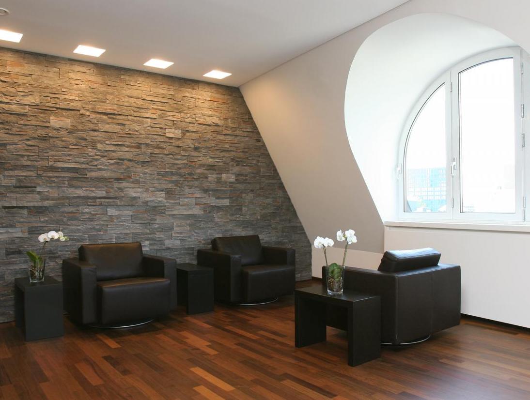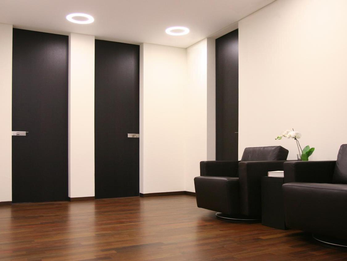 In unmittelbarer Nähe der turbulenten Frankfurter » Fressgass« stellt die Praxisklinik an der alten Oper einen Ort der Ruhe und Entspannung dar. Im oberen Geschoss des Neubaus ist für unseren Bauherrn eine individuelle Praxis für plastische Chirurgie entstanden. Der Empfangsbereich mit einer Theke aus wenge-farbigem Holz erinnert eher an die Rezeption eines Hotels als an medizinische Versorgungsbereiche in ihrer häufig üblichen Sterilität. Hinter raumhohen Holztüren liegen die Beratungs – und Behandlungsräume. Auf der anderen Gebäudeseite befindet sich der OP-Trakt mit Aufwachraum, Patientenzimmern, Steril – und Sozialräumen. Der OP-Raum verfügt über modernste Technik und eine Reinluftdecke. Leistungsphasen der HOAI: LP 1-8. Praxis für plastische Chirurgie mit OP-Trakt, Entwurf und Realisierung des Gesamtkonzeptes, Innenausbau in Gewerbefläche, ca. 470 qm, Dr. med. Marcus Tammer. Fotos: Sandra Hauer, Nahdran Photografie.