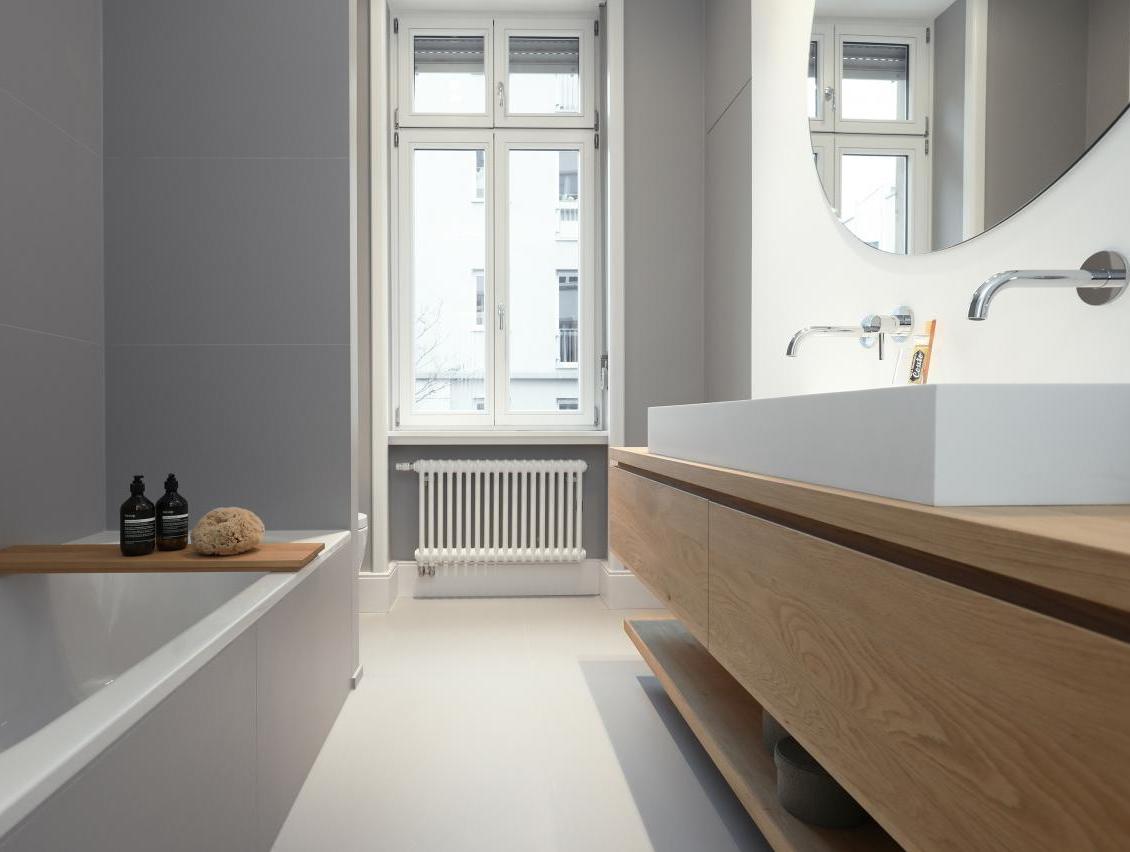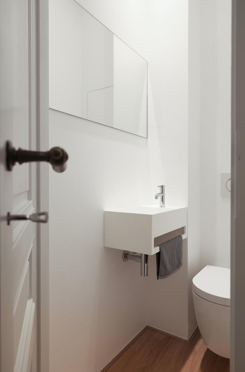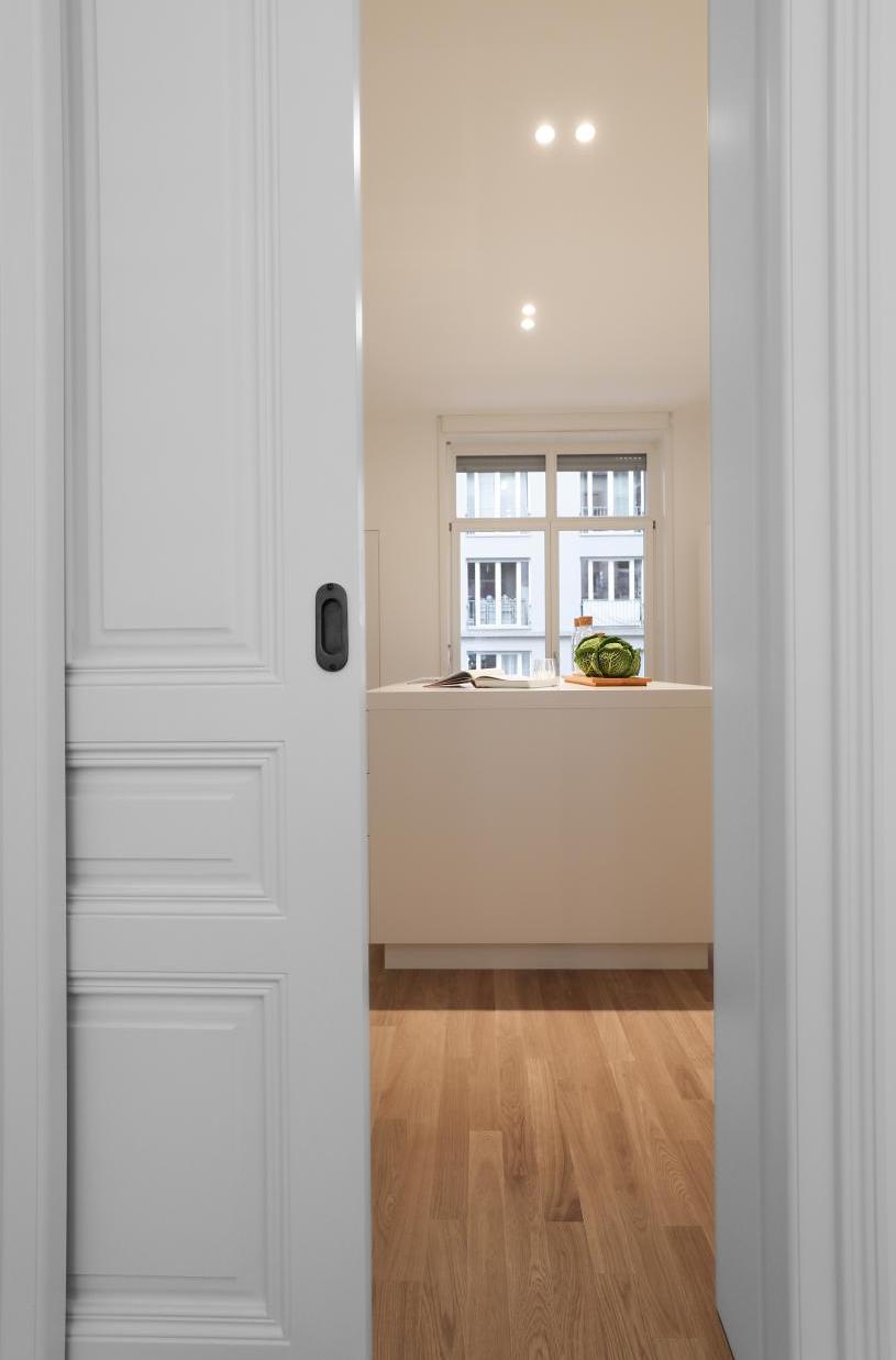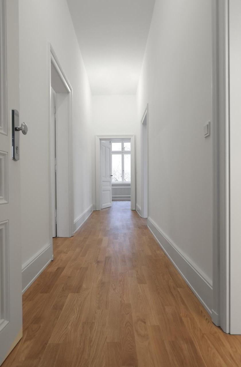 Leistungsphasen der HOAI: LP 1-3 und 5-8. Entwurf und Realisierung im Bestand. Sanierung und Innenausbau im Altbau, ca. 100 qm Wohnfläche, Bad und Gäste WC. Für unsere Bauherren sanierten und renovierten wir zwei ca. 100 qm große Altbauwohnung im Frankfurter Nordend. Sanitär-, Heizungs- und Elektroinstallation wurde vollständig erneuert. Wände und Abhangdecken wurden abgebrochen, andere ergänzt, glatt gespachtelt und mit Malervlies tapeziert. Bad und Gäste WC wurden neu gestaltet. Standardtüren wurden demontiert. Alle fehlenden Stilelemente wie Kassettentüren, hohe Sockelleisten und Profile an den Fensterlaibungen wurden aus dem Bestand anderer Wohnungen wieder verwendet oder originalgetreu nachgebaut. Bauseitige Bodenbeläge wurden durch matt geöltes Eichenparkett ersetzt. Einflügelige Kunststofffenster waren 2018 in allen Geschossen durch zweiflügelige Holzfenster ersetzt worden. 2012 wurde die Wohnung im EG des Wohnhauses kernsaniert. Fotos: Sandra Hauer, Nahdran Photografie.