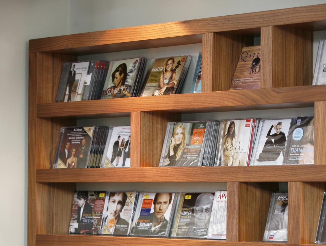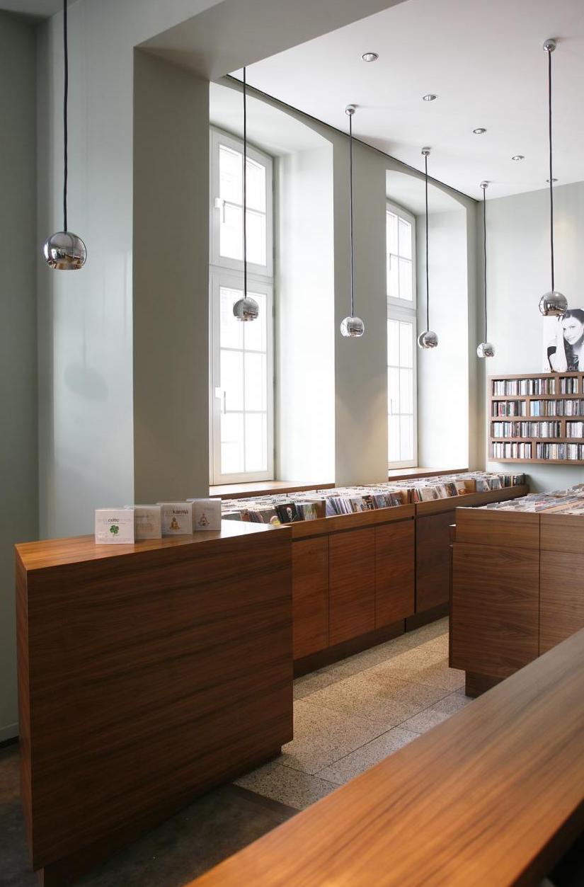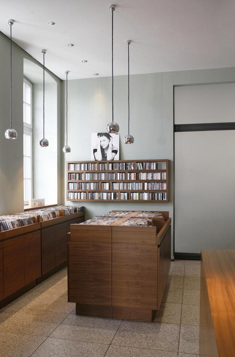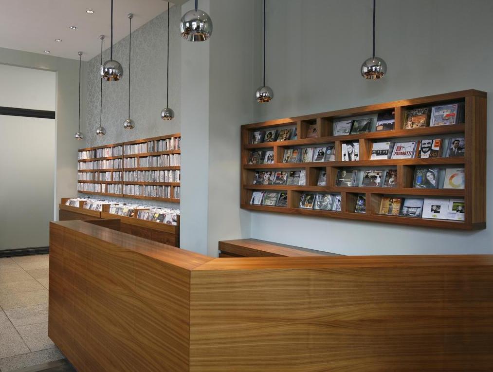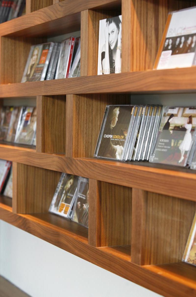Leistungsphasen der HOAI: LP 1-3, 5-8. Entwurf und Realisierung des Gesamtkonzeptes, Innenausbau, ca. 100 qm Ladenfläche auf zwei Ebenen. Im Erdgeschoß geht es vorwiegend um Klassik, im Keller ist die Jazzmusik untergebracht. Frankfurt/M, Innenstadt. Fotos: Sandra Hauer, Nahdran Photografie.